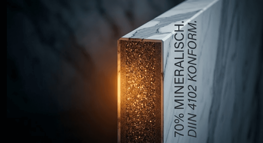 A1 / A2 — Nicht brennbar. Mineralische Platten, Gipskarton, Naturstein. Die höchste Klasse, aber für dekorative Wandpaneele praktisch unerreichbar, weil jede Kunststoff-Komponente A1 ausschließt.