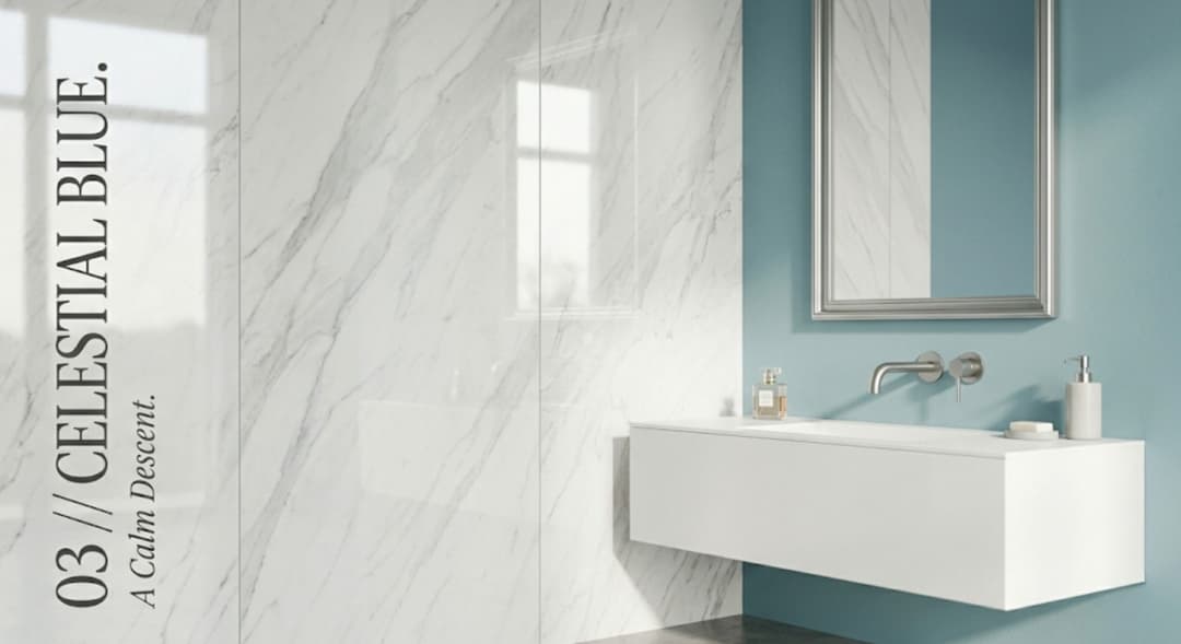 Pinterest-Daten (2025) zeigen +50 % Suchvolumen für "sky blue interior". Ein eis-getauchter, leicht grünlicher Blau-Ton, kombiniert mit viel Weiß und silbrigem Stein. Wirkt besonders schön in Badezimmern und Schlafzimmern — bringt Ruhe rein.
