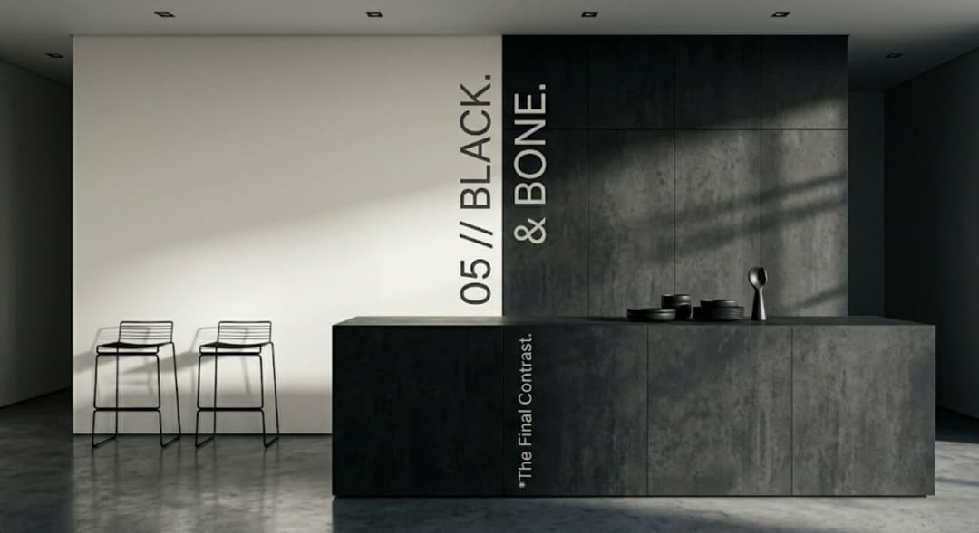 Ein kontrastreiches Minimalismus-Update. Tiefes Schwarz als Akzent gegen cremiges Bone-Weiß. Kein sterilisiert-weißer Raum mehr, aber auch kein überladener Luxus — nur zwei Farben, präzise gesetzt.